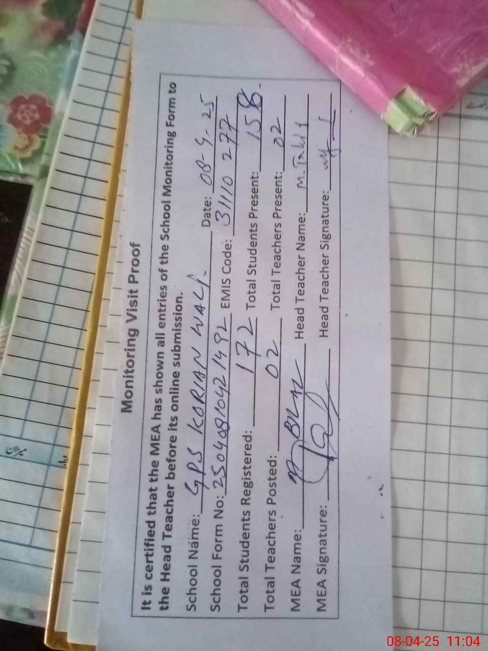 | Attendance Register | Head Teacher | MEA with School | Visit Proof |
