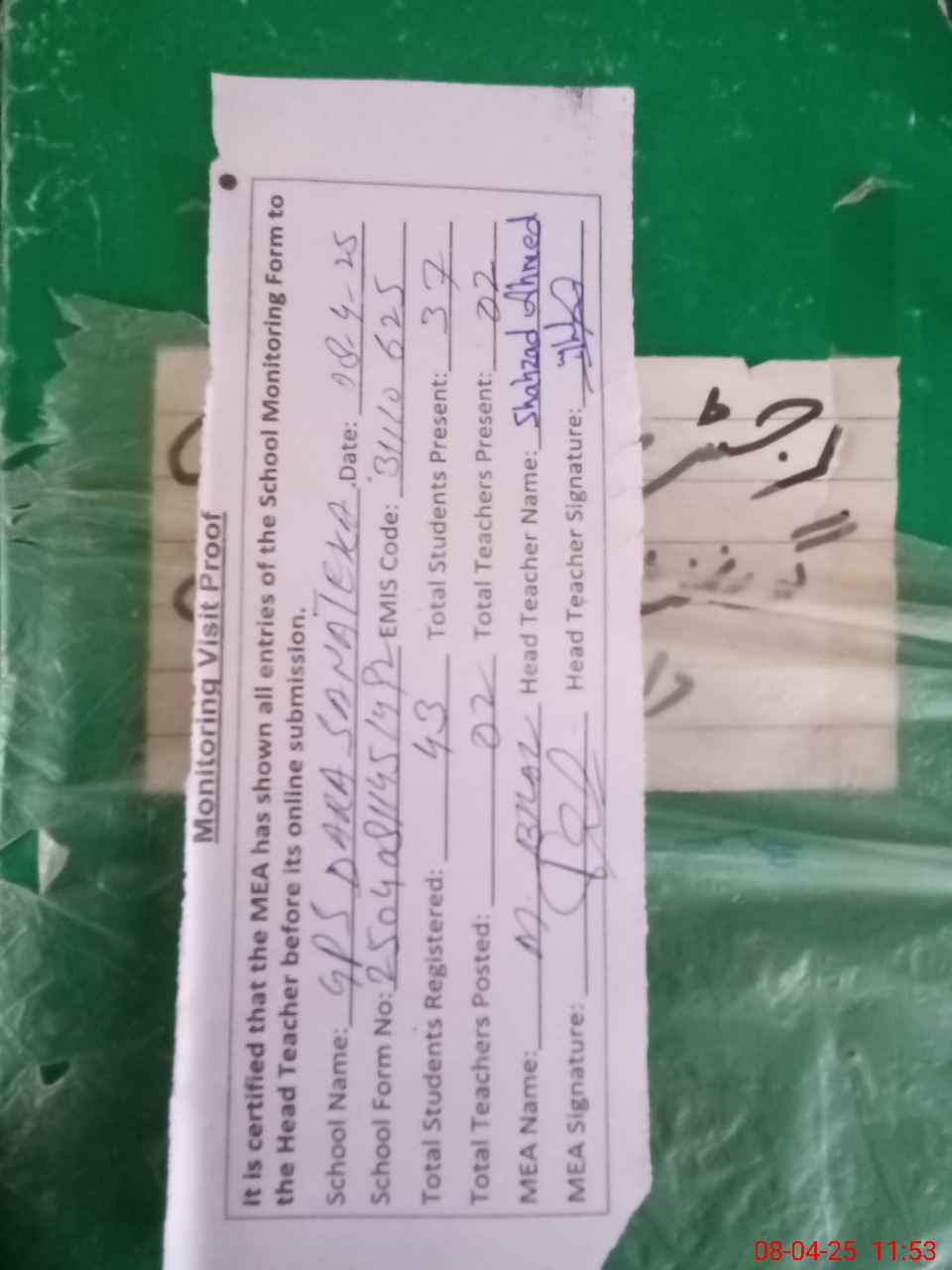 | Attendance Register | Head Teacher | MEA with School | Visit Proof |