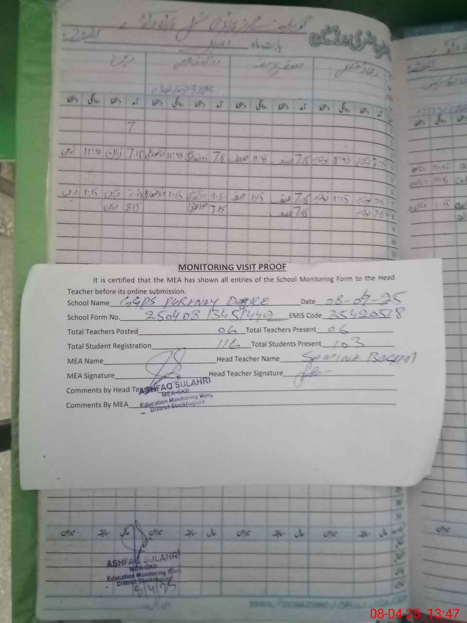 | Attendance Register | Head Teacher | MEA with School | Visit Proof |