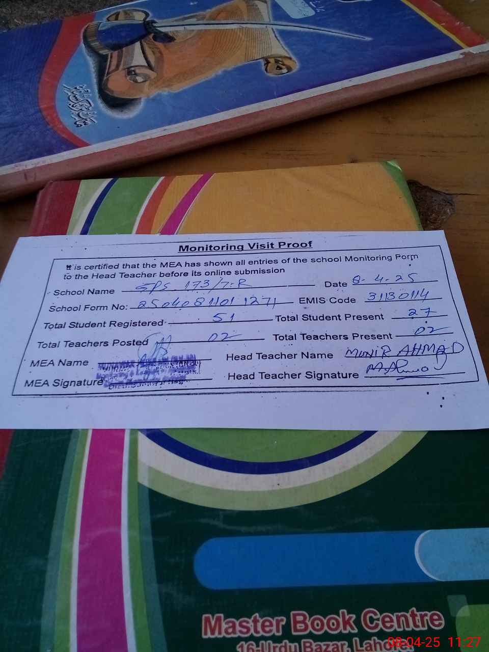 | Attendance Register | Head Teacher | MEA with School | Visit Proof |