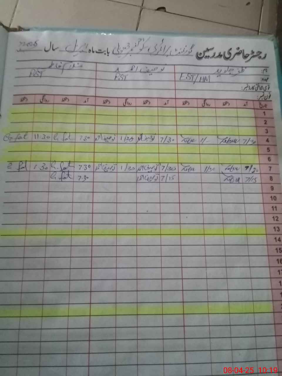 | CNIC | Full Name | Designation | R/C | Absence During Last Calender Month |