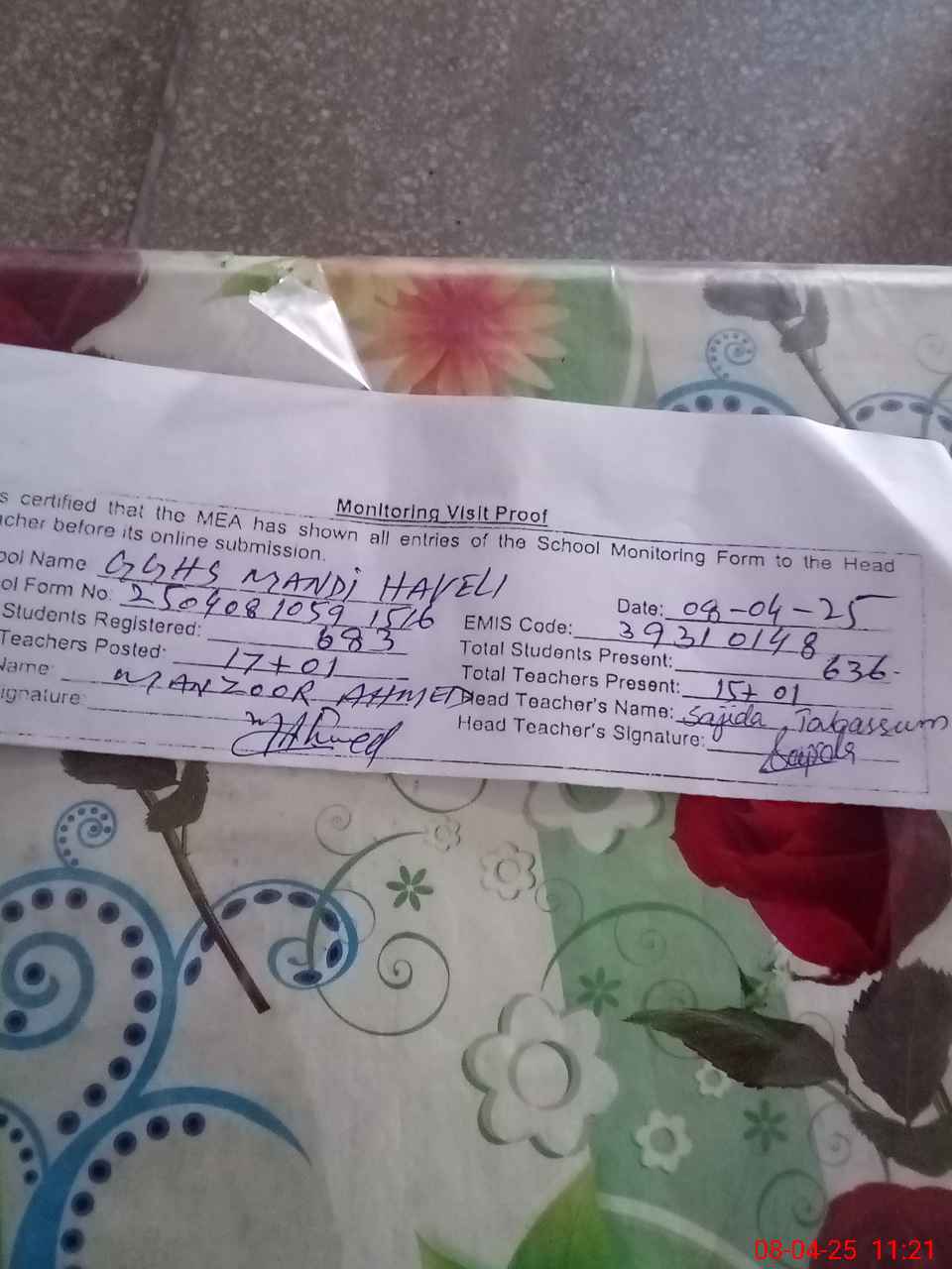| Attendance Register | Head Teacher | MEA with School | Visit Proof |