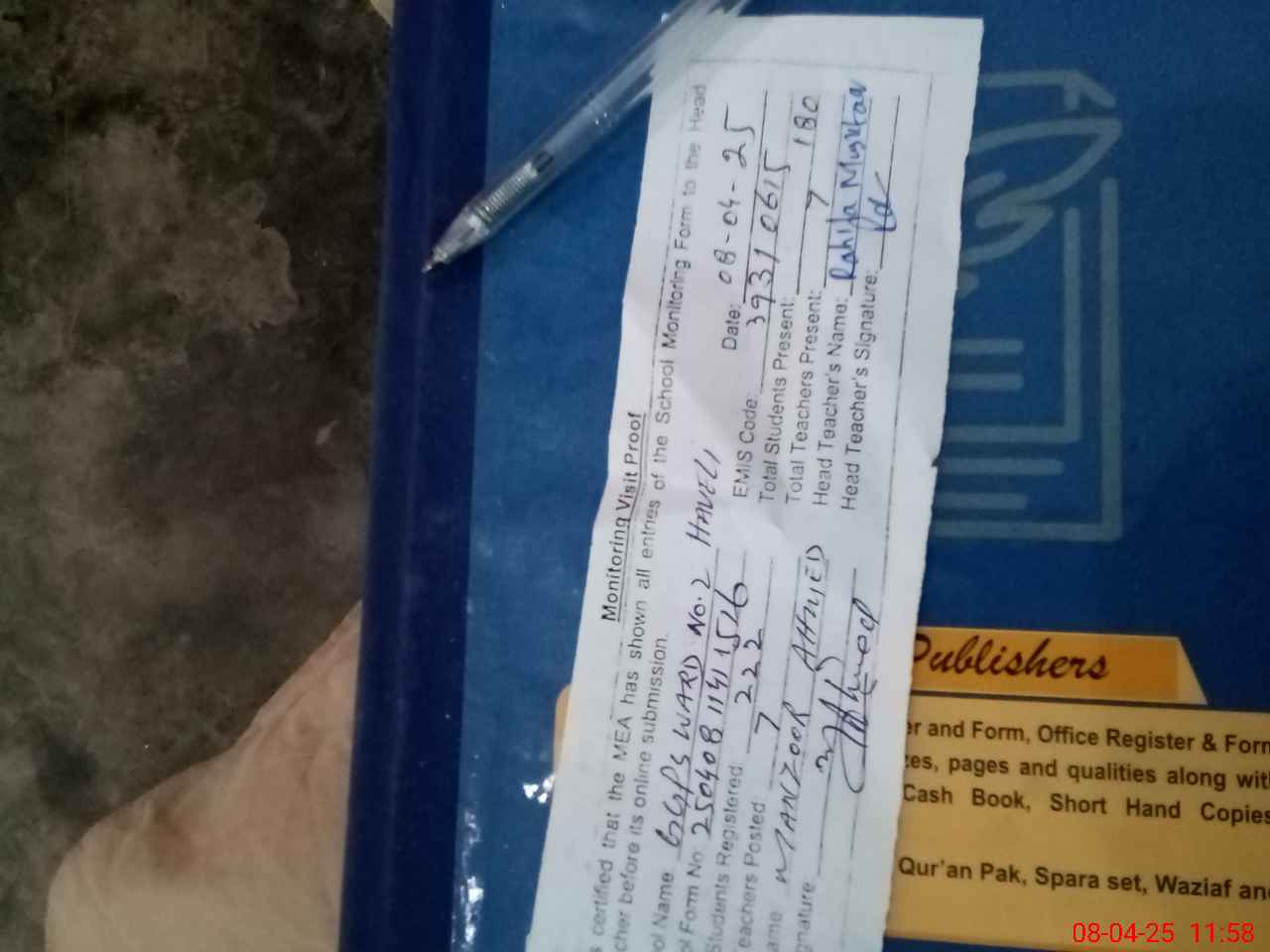 | Attendance Register | Head Teacher | MEA with School | Visit Proof |
