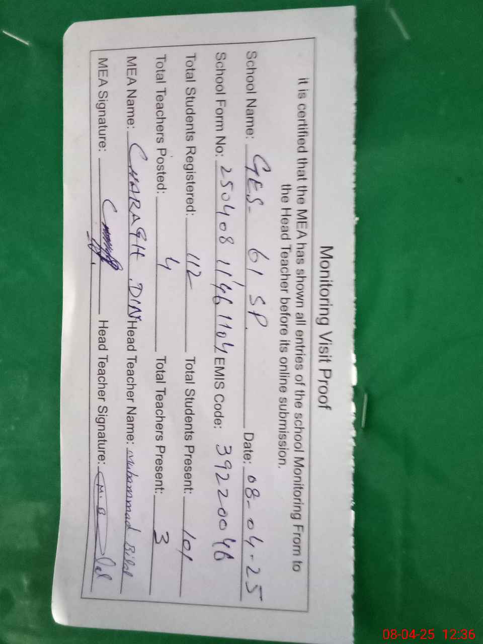 | Attendance Register | Head Teacher | MEA with School | Visit Proof |