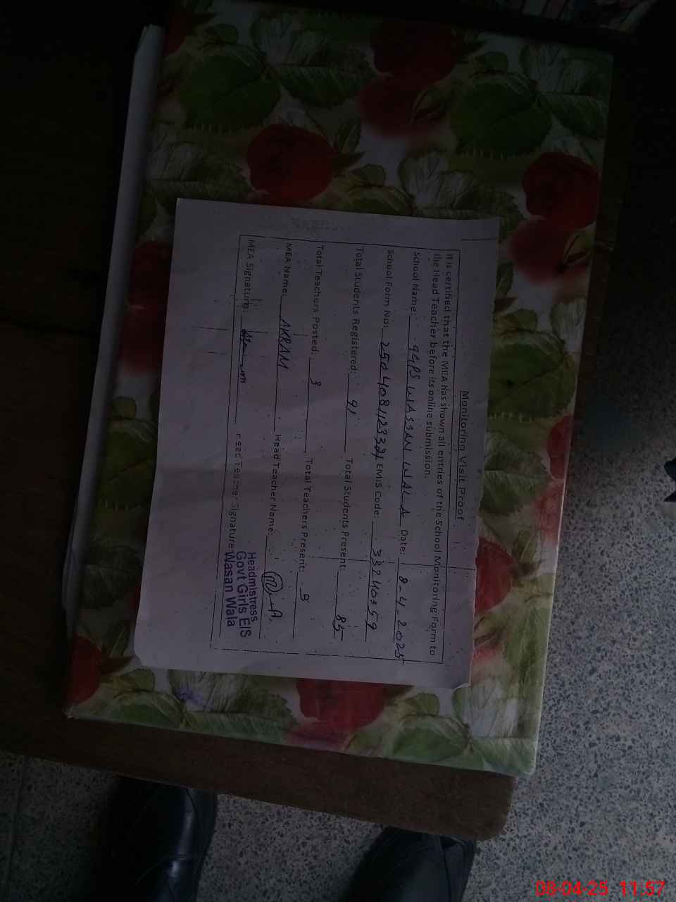 | Attendance Register | Head Teacher | MEA with School | Visit Proof |