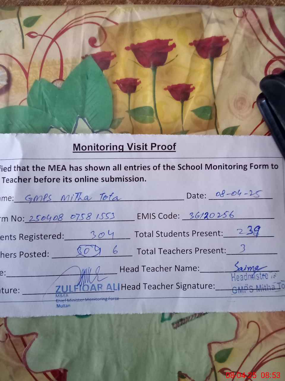 | Attendance Register | Head Teacher | MEA with School | Visit Proof |