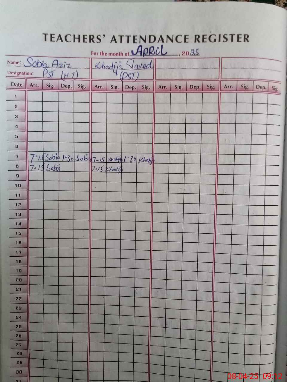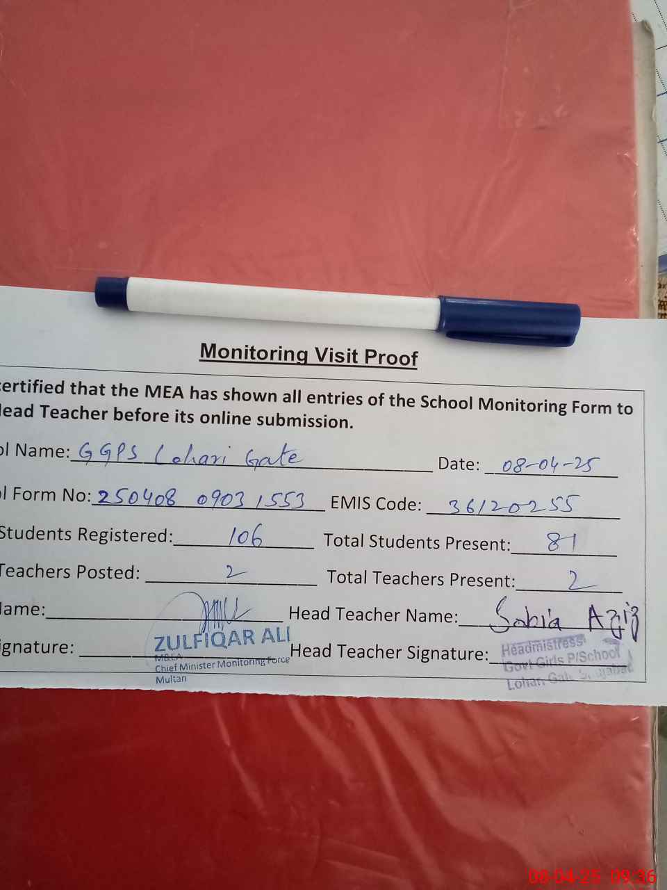 | Attendance Register | Head Teacher | MEA with School | Visit Proof |