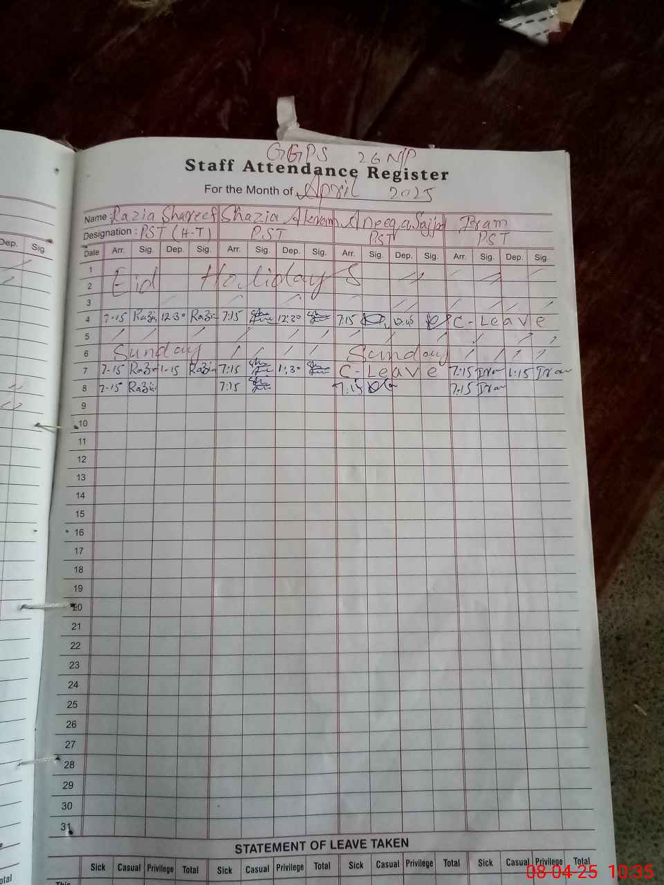 | Leave | Duty | Absent | Maternity | Medical | Ex- Pak |