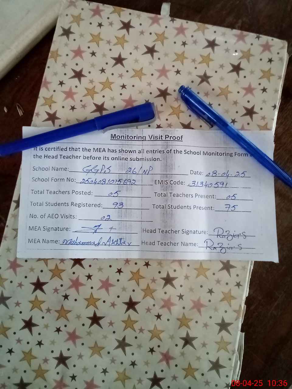 | Attendance Register | Head Teacher | MEA with School | Visit Proof |