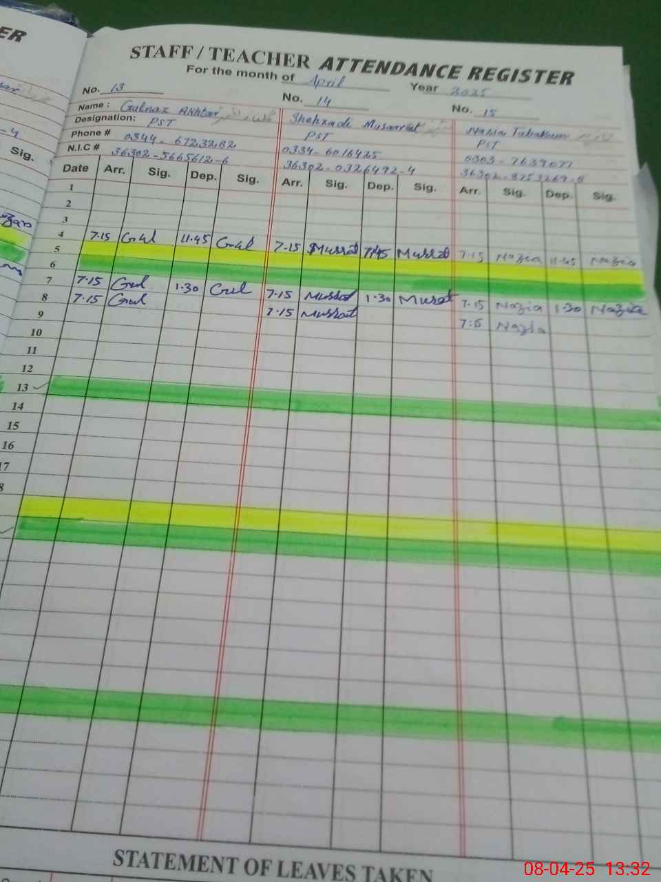 | 36**** | Sh**** Wa**** Ba**** | SST | Regular | 0 | 0 | 0 | 0 | 0 | 0 | 0 | 0 | 0 | Exam Duty |