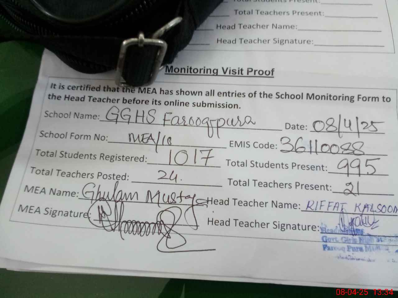 | Attendance Register | Head Teacher | MEA with School | Visit Proof |