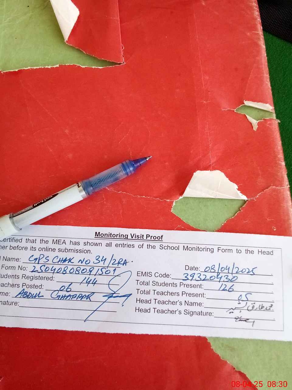 | Attendance Register | Head Teacher | MEA with School | Visit Proof |