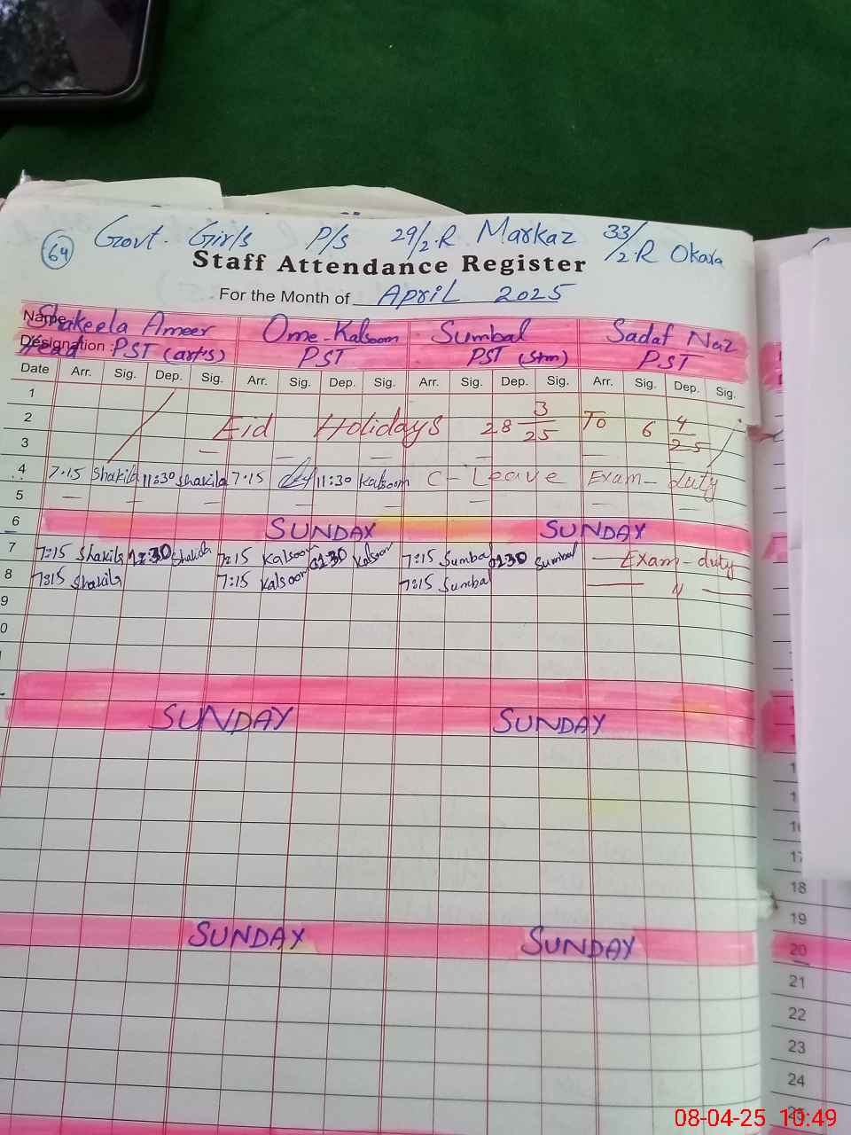 | 35**** | Sa**** Na**** | PST | Regular | 2 | 2 | 0 | 0 | 0 | 0 | 0 | 0 | 2 | Exam Duty |