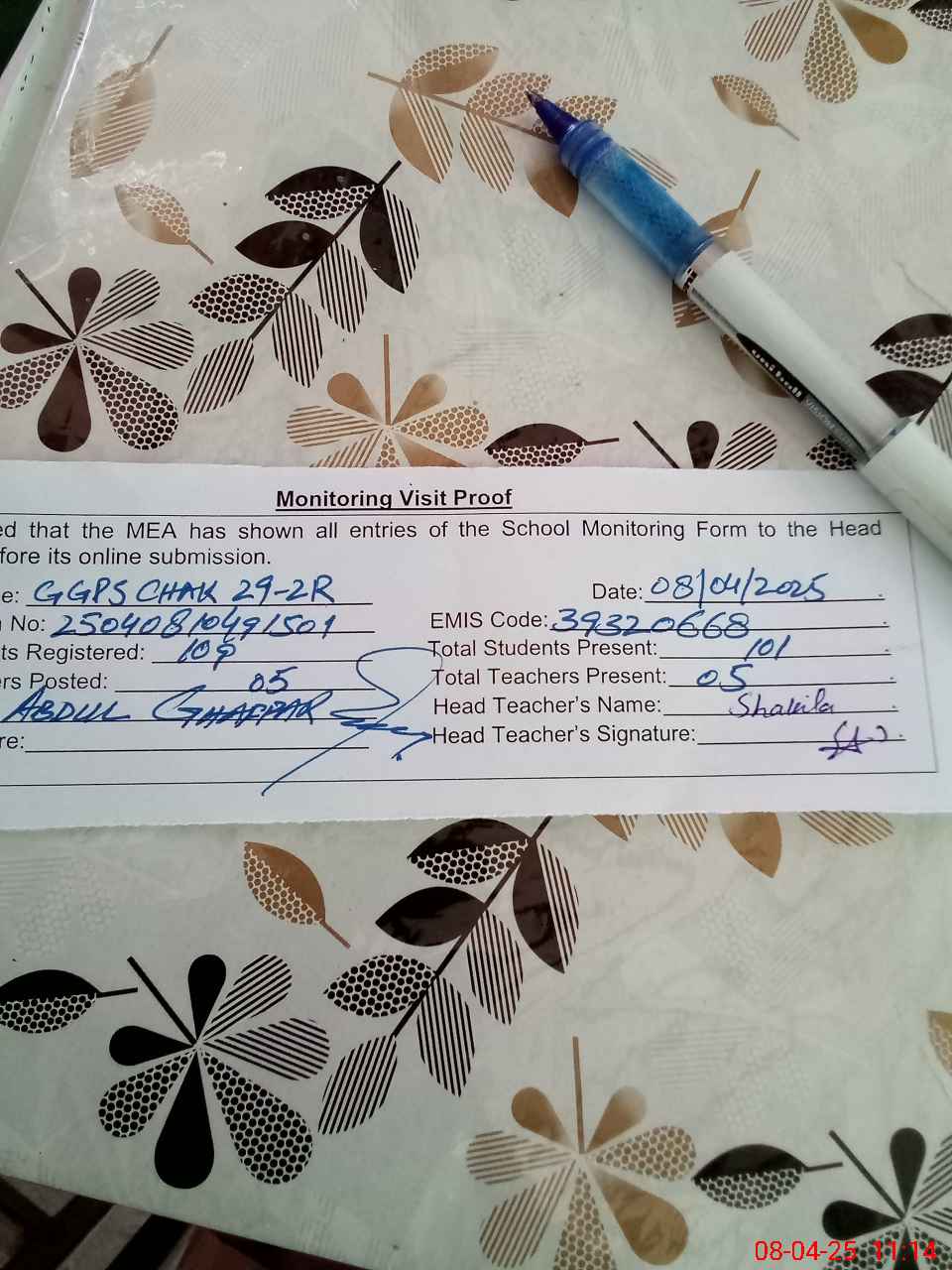 | Name: SH**** AM**** Designation: (School Headmaster's/Headmistress's) PST Phone/Cell Number: 03**** |