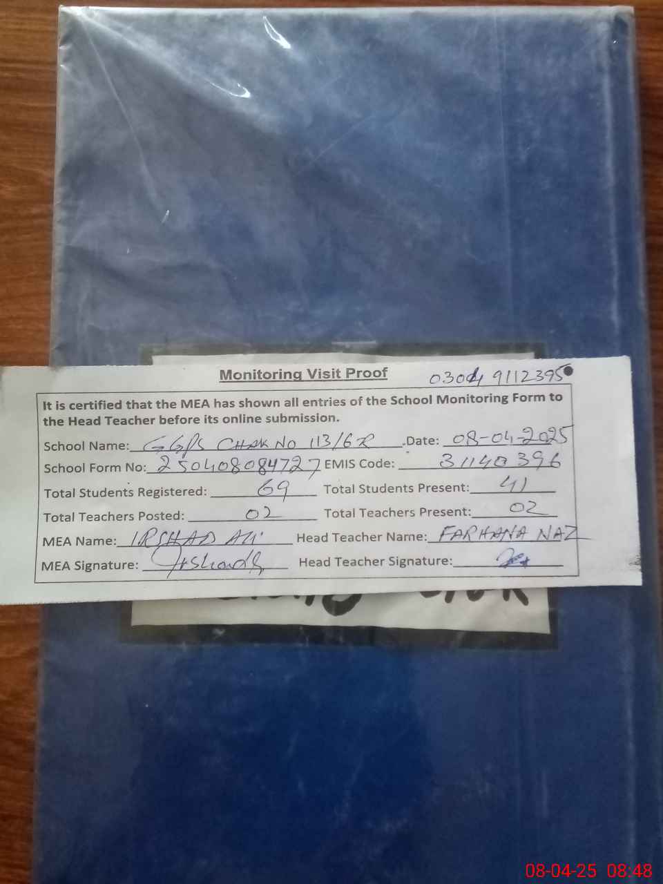 | Attendance Register | Head Teacher | MEA with School | Visit Proof |