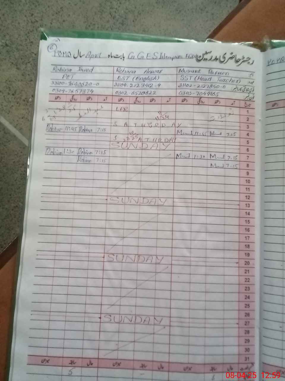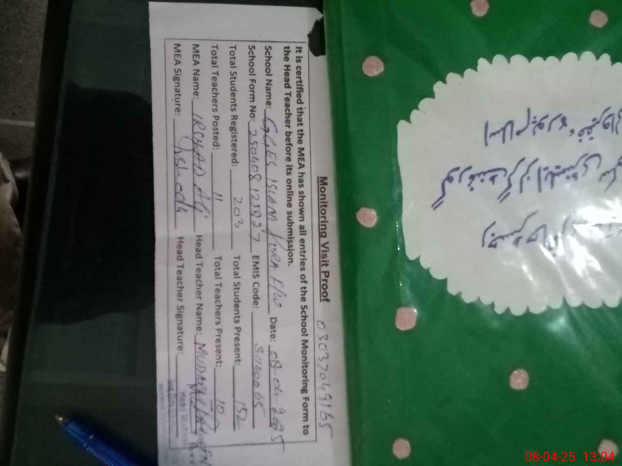 | Name: MU**** PE**** Designation: (School Headmaster's/Headmistress's) S.S.T.(G) Phone/Cell Number: 03**** |