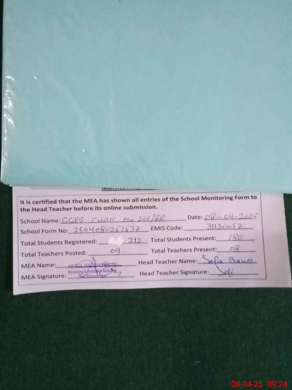 | Attendance Register | Head Teacher | MEA with School | Visit Proof |