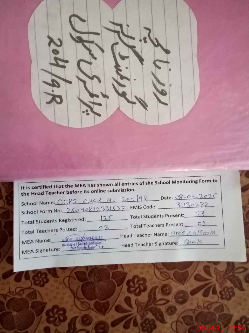 | Certified that this School was Inspected by the Undersigned MEA/DMO Today and the Information Stated Above is as Per Record. | |||||