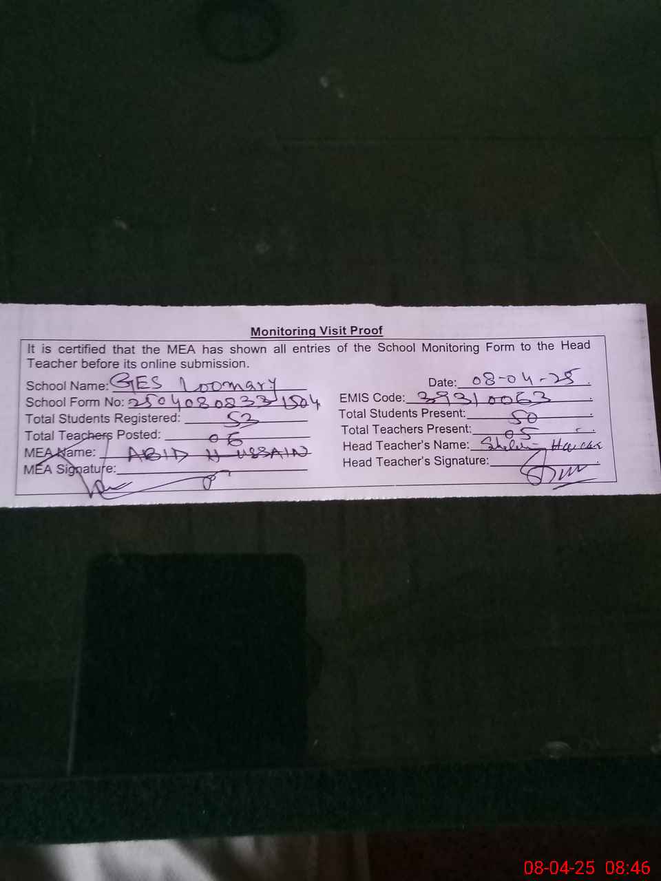 | Attendance Register | Head Teacher | MEA with School | Visit Proof |