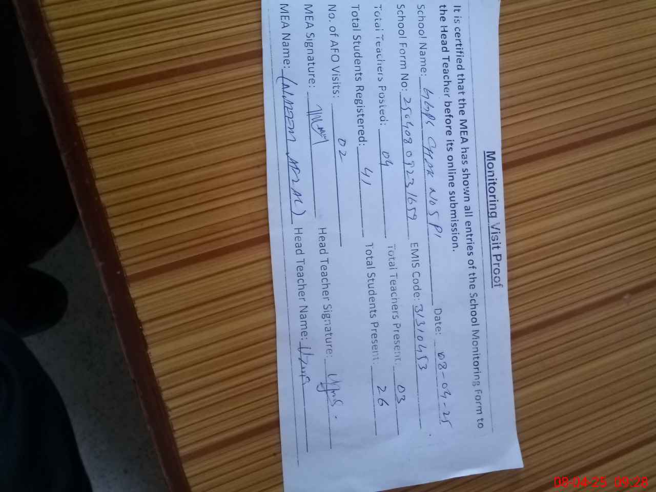 | Attendance Register | Head Teacher | MEA with School | Visit Proof |