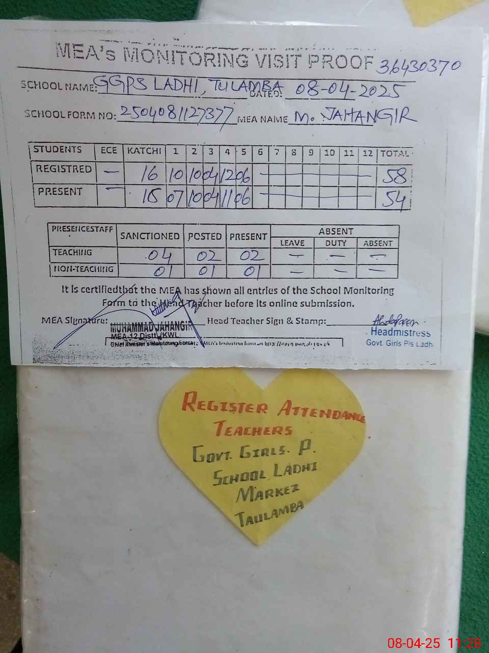 | EMIS Code: 36430370 | Name of School: GGPS LADHI, TULAMBA | |||