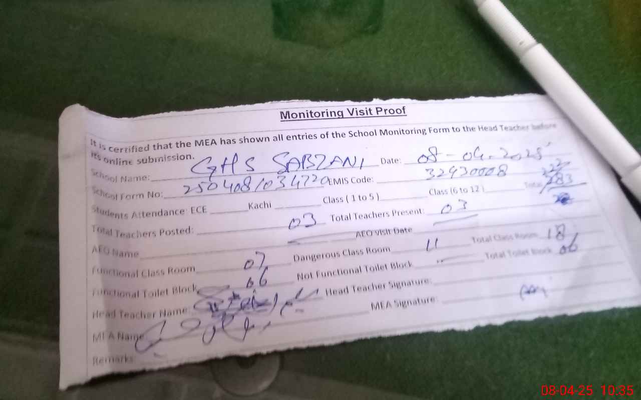 | EMIS Code: 32430008 | Name of School: GHS SABZANI | |||