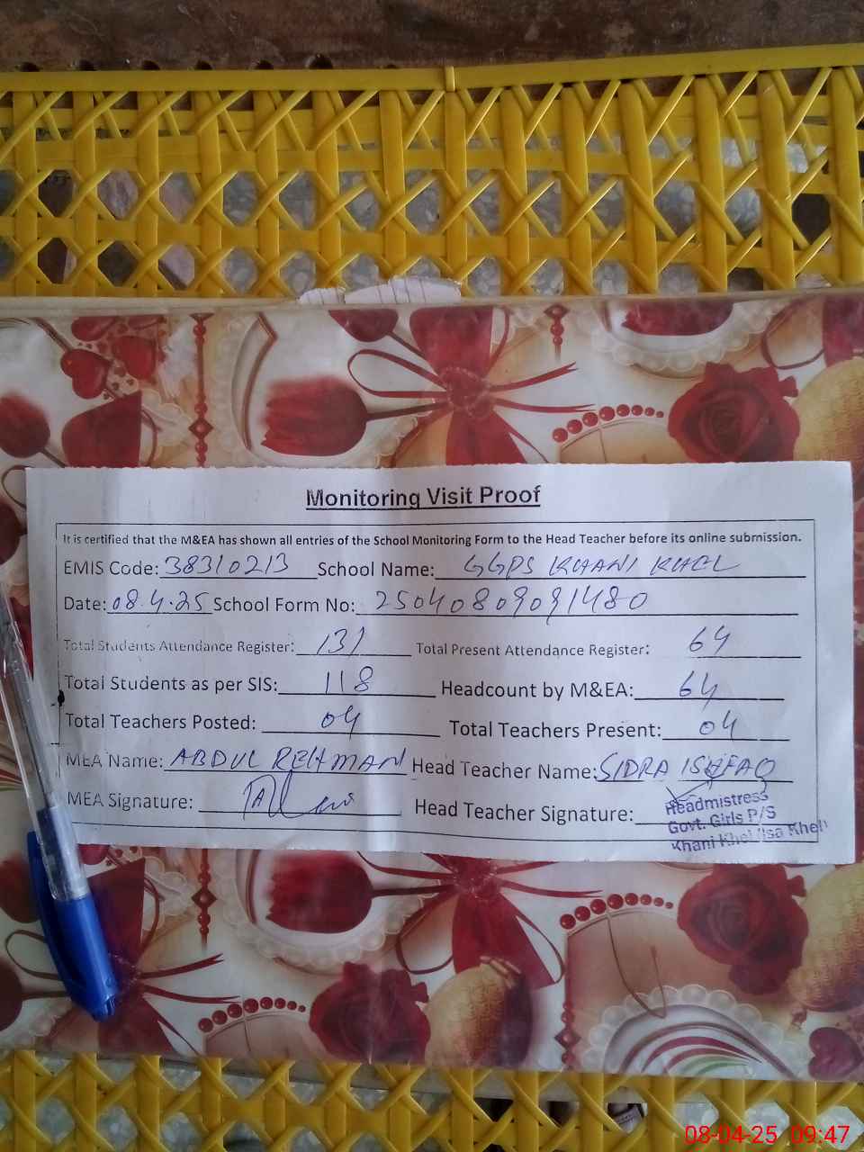 | EMIS Code: 38310213 | Name of School: GGPS KHANI KHEL | |||