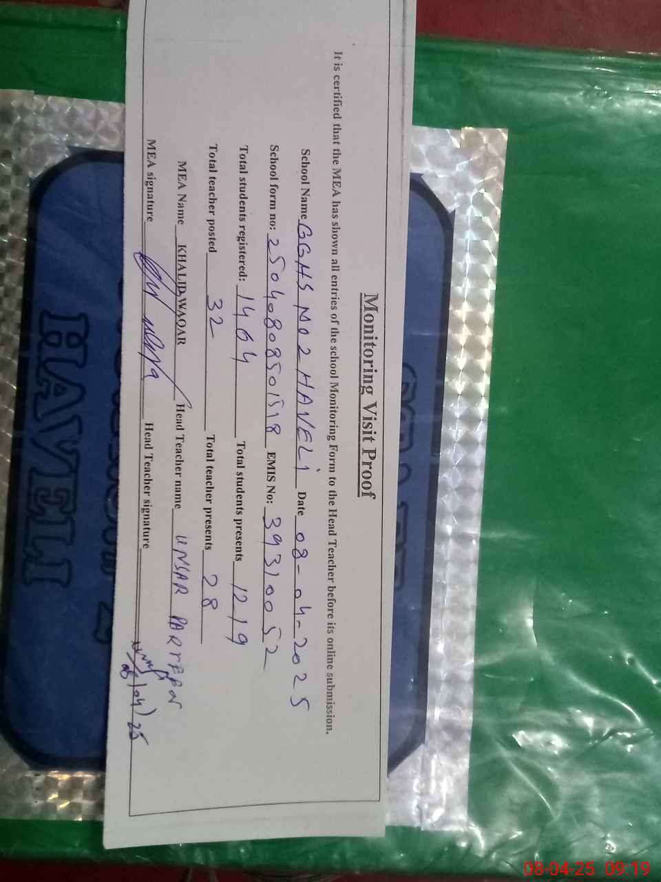 | Attendance Register | Head Teacher | MEA with School | Visit Proof |