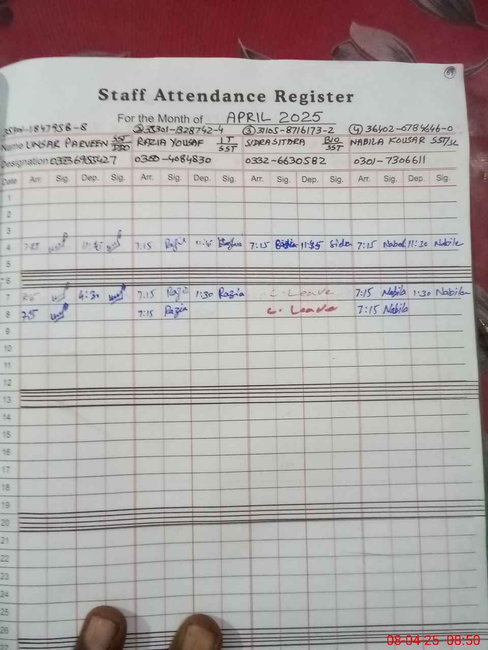 | CNIC | Full Name | Designation | R/C | Absence During Last Calender Month |