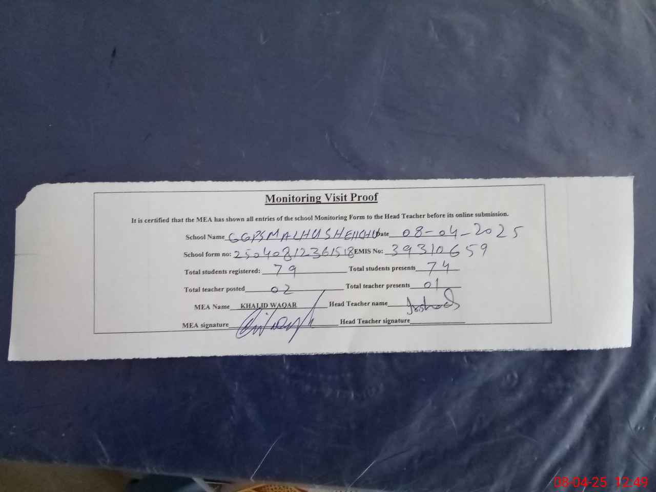 | Attendance Register | Head Teacher | MEA with School | Visit Proof |