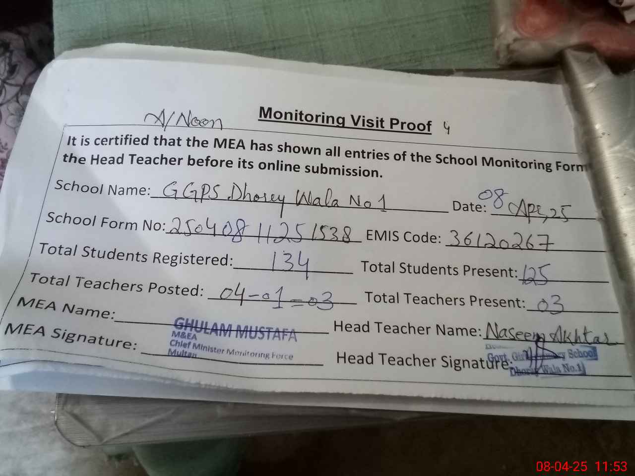 | Monitoring Date: 08-04-2025 | Start Time: 08-04-2025 11:25 AM | End Time: 08-04-2025 11:54 AM | Name of MEA: Gh**** Mu**** | |