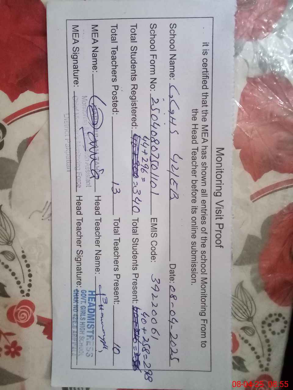 | Attendance Register | Head Teacher | MEA with School | Visit Proof |