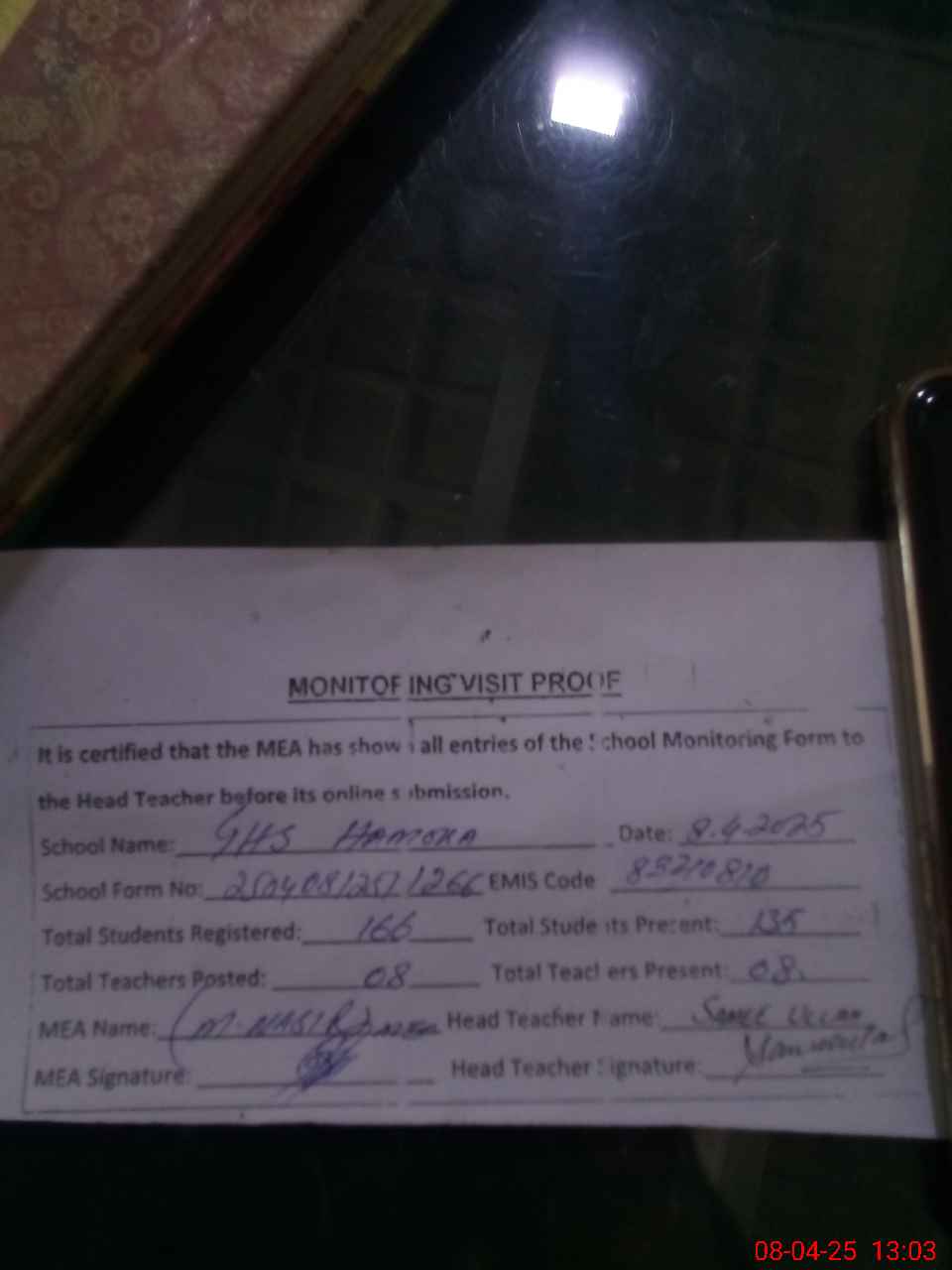 | Attendance Register | Head Teacher | MEA with School | Visit Proof |