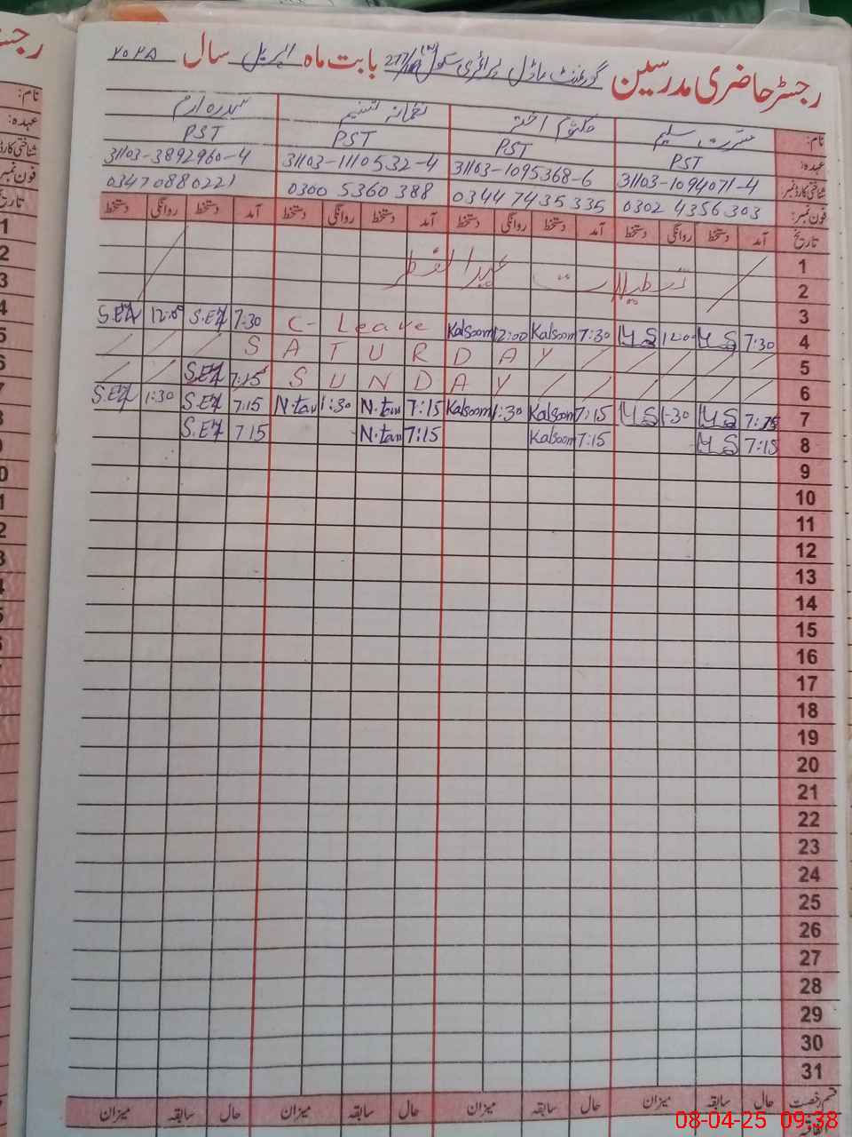 | CNIC | Full Name | Designation | R/C | Absence During Last Calender Month |