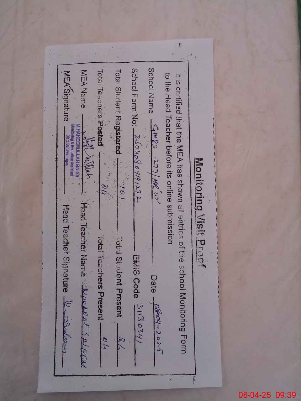 | Attendance Register | Head Teacher | MEA with School | Visit Proof |