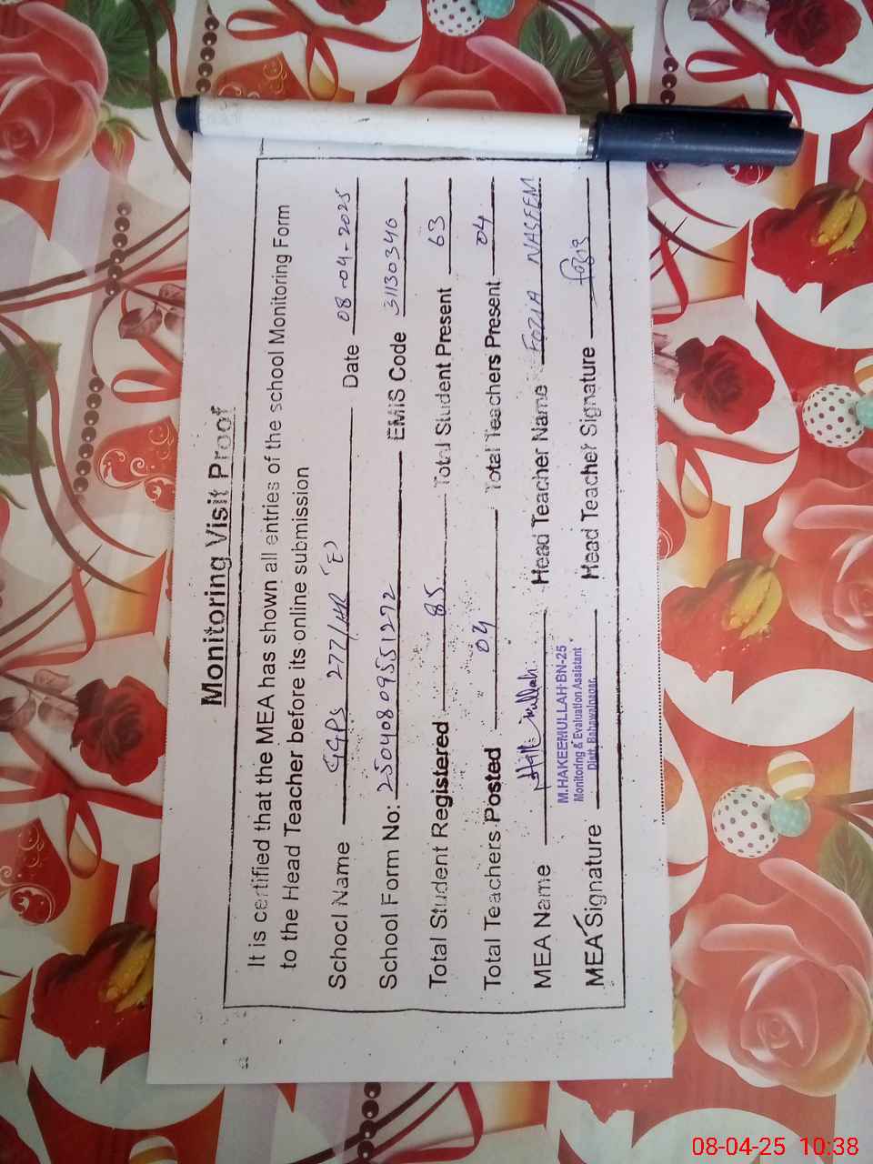 | Attendance Register | Head Teacher | MEA with School | Visit Proof |