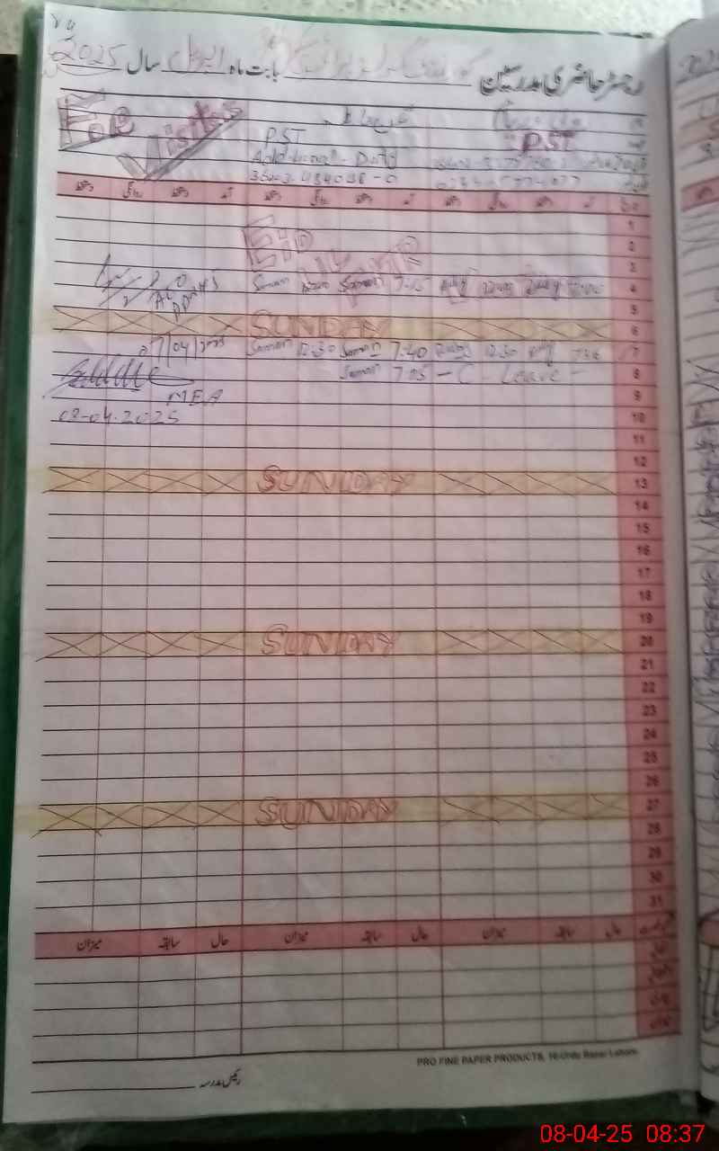 | CNIC | Full Name | Designation | R/C | Absence During Last Calender Month |