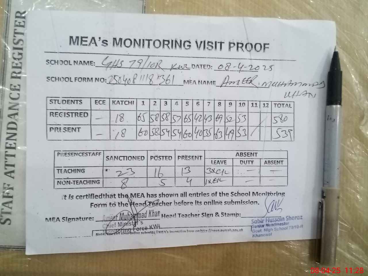 | Attendance Register | Head Teacher | MEA with School | Visit Proof |