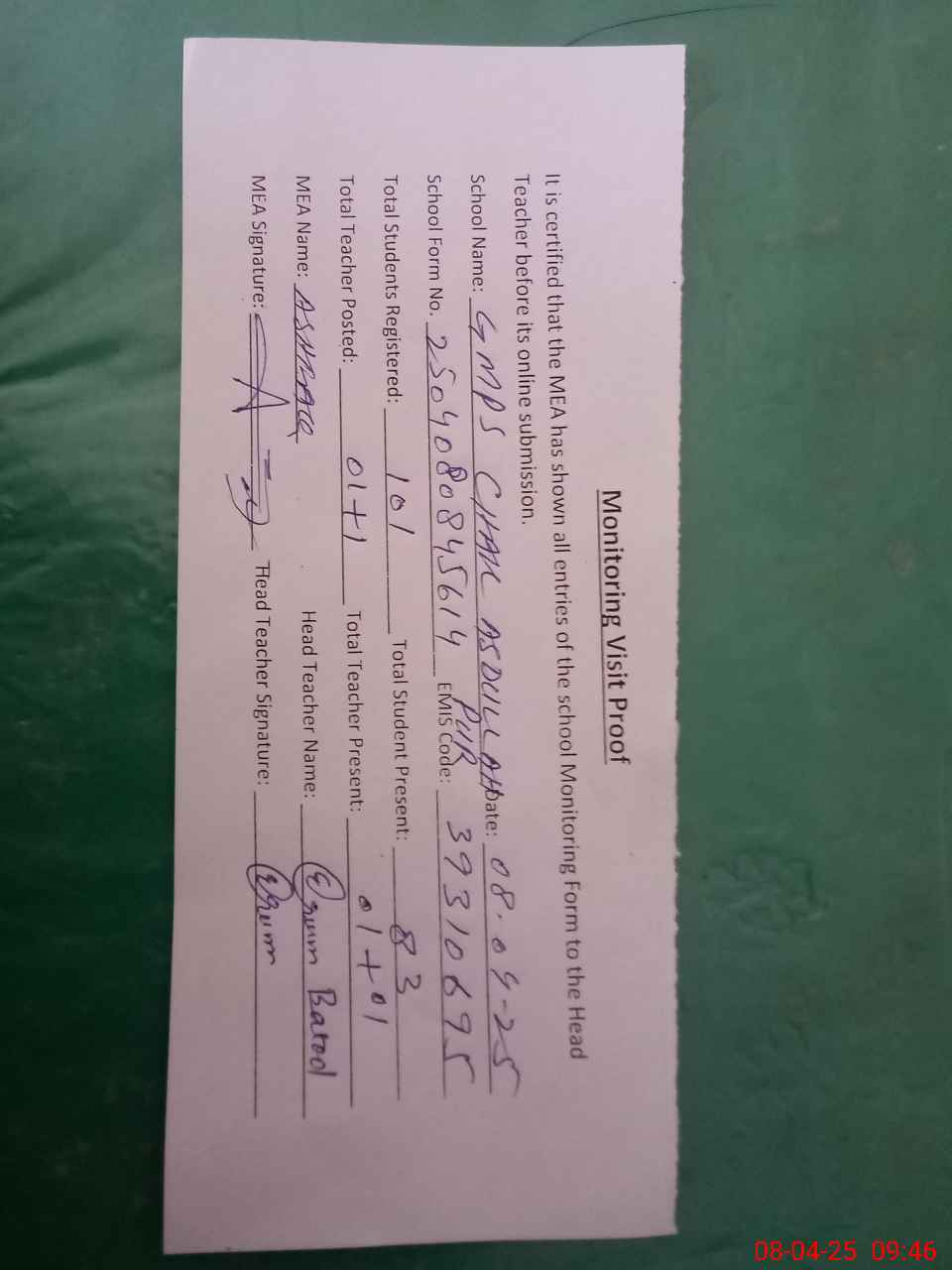 | EMIS Code: 39310695 | Name of School: GMPS CHAK ASAD ULLAH PUR | |||