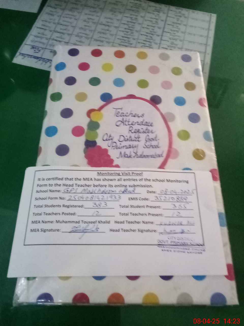 | Attendance Register | Head Teacher | MEA with School | Visit Proof |