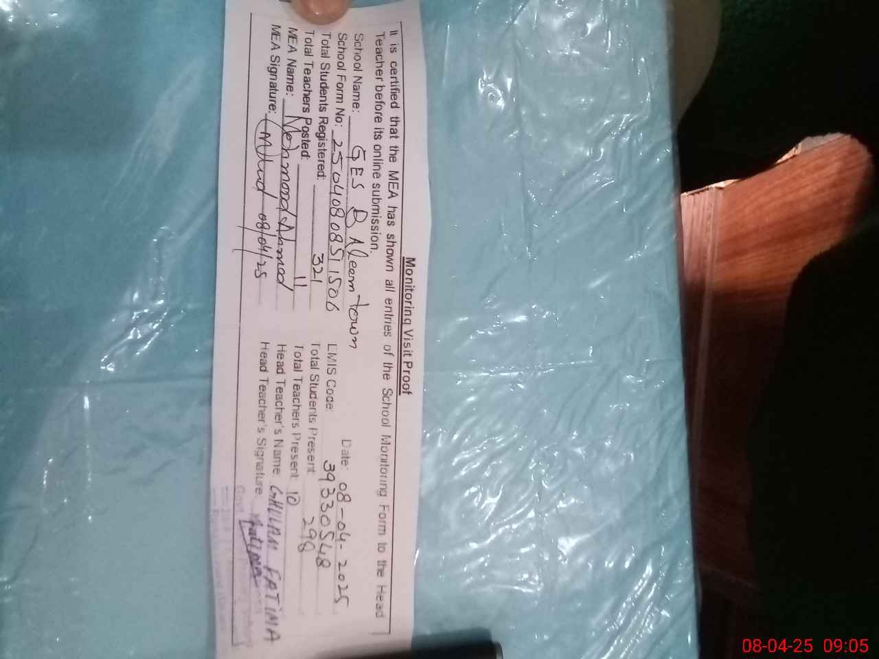| Attendance Register | Head Teacher | MEA with School | Visit Proof |