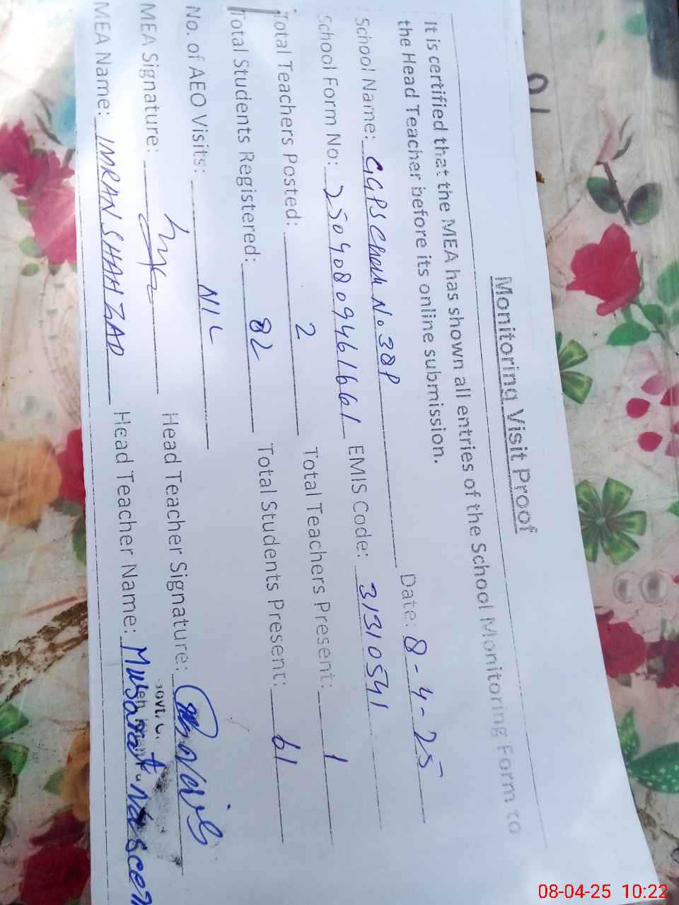 | EMIS Code: 31310541 | Name of School: GGPS CHAK NO 38/P | |||