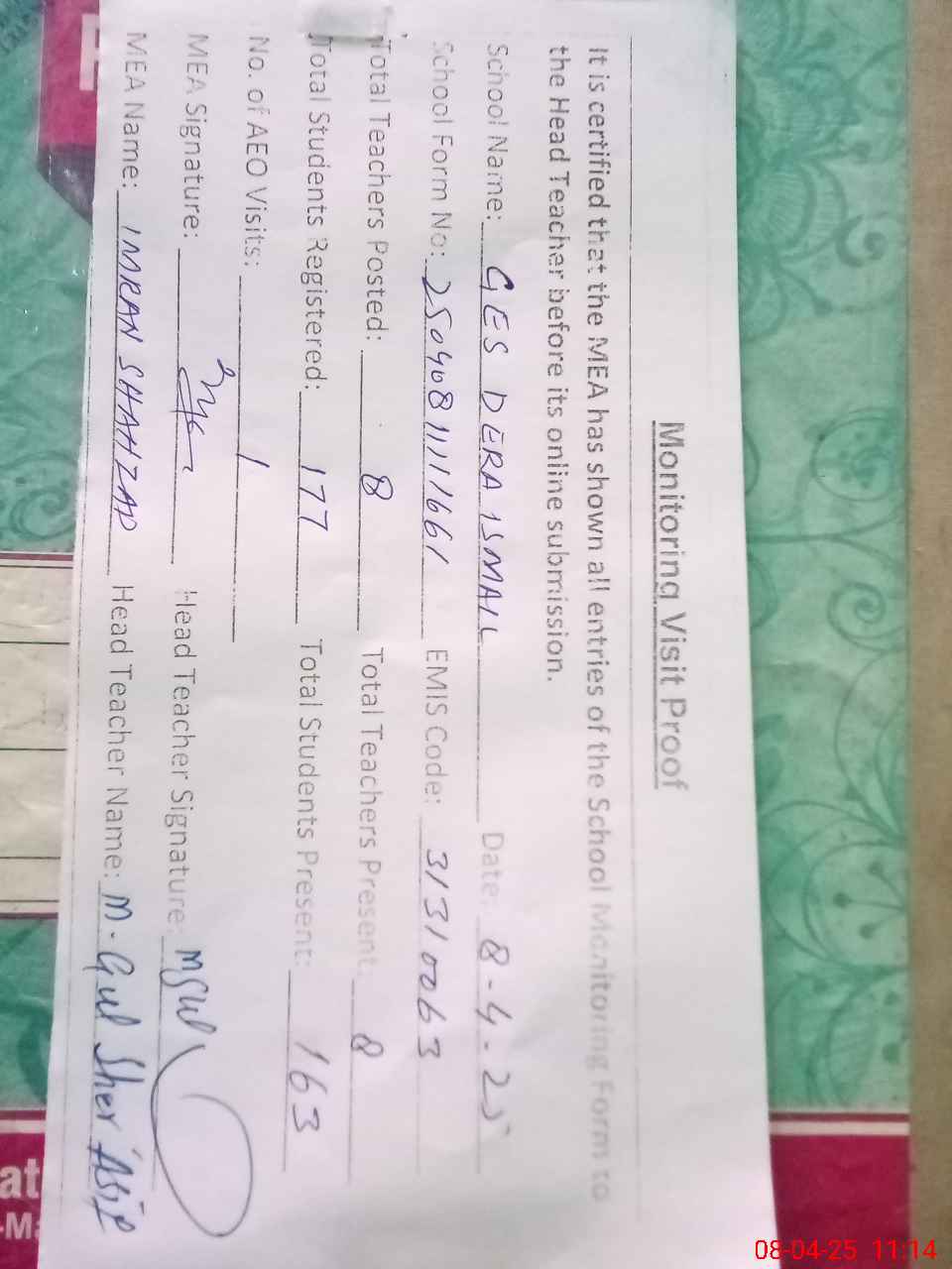 | Attendance Register | Head Teacher | MEA with School | Visit Proof |