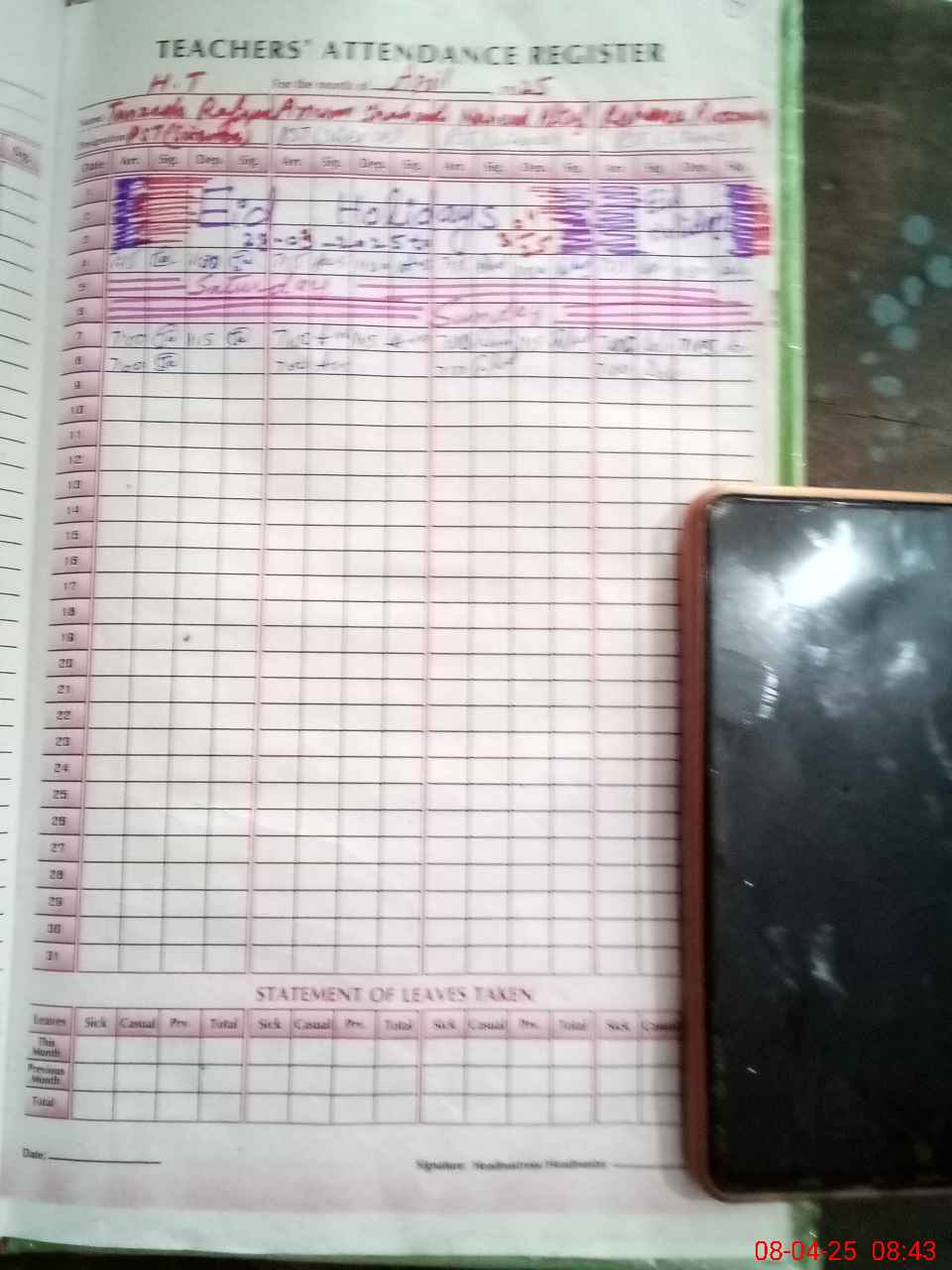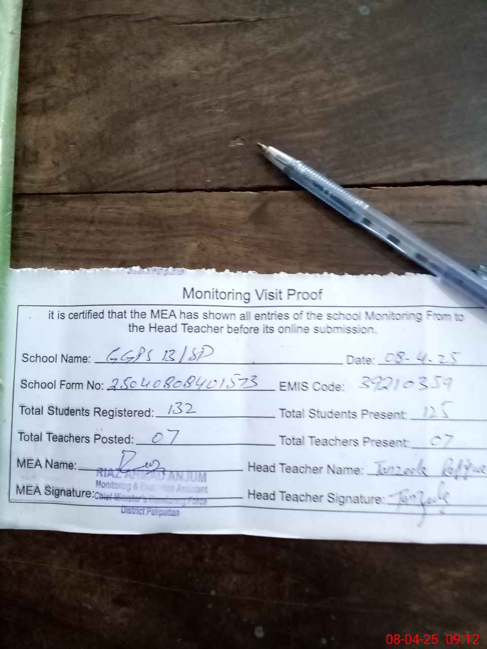| Attendance Register | Head Teacher | MEA with School | Visit Proof |