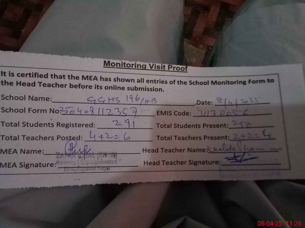 | Attendance Register | Head Teacher | MEA with School | Visit Proof |