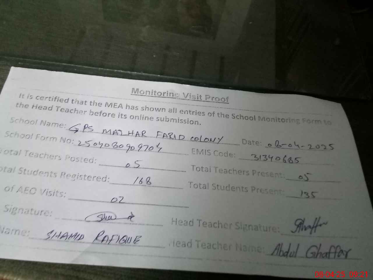 | Attendance Register | Head Teacher | MEA with School | Visit Proof |