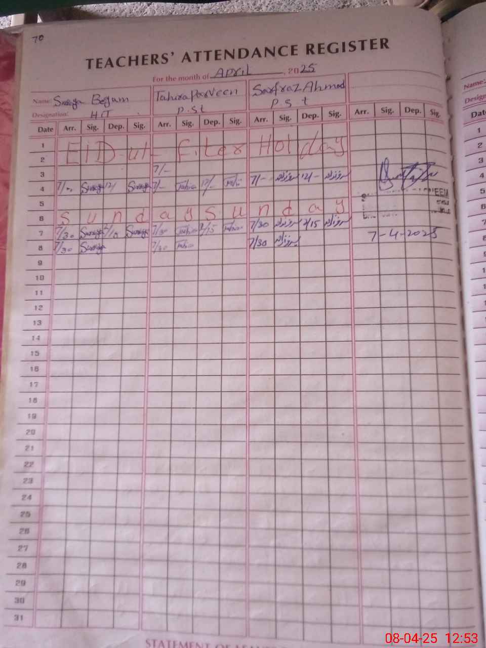 | Name: SU**** BE**** Designation: (School Headmaster's/Headmistress's) PST Phone/Cell Number: 03**** |