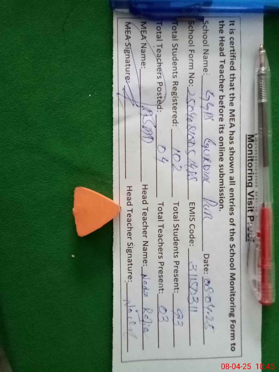 | Attendance Register | Head Teacher | MEA with School | Visit Proof |