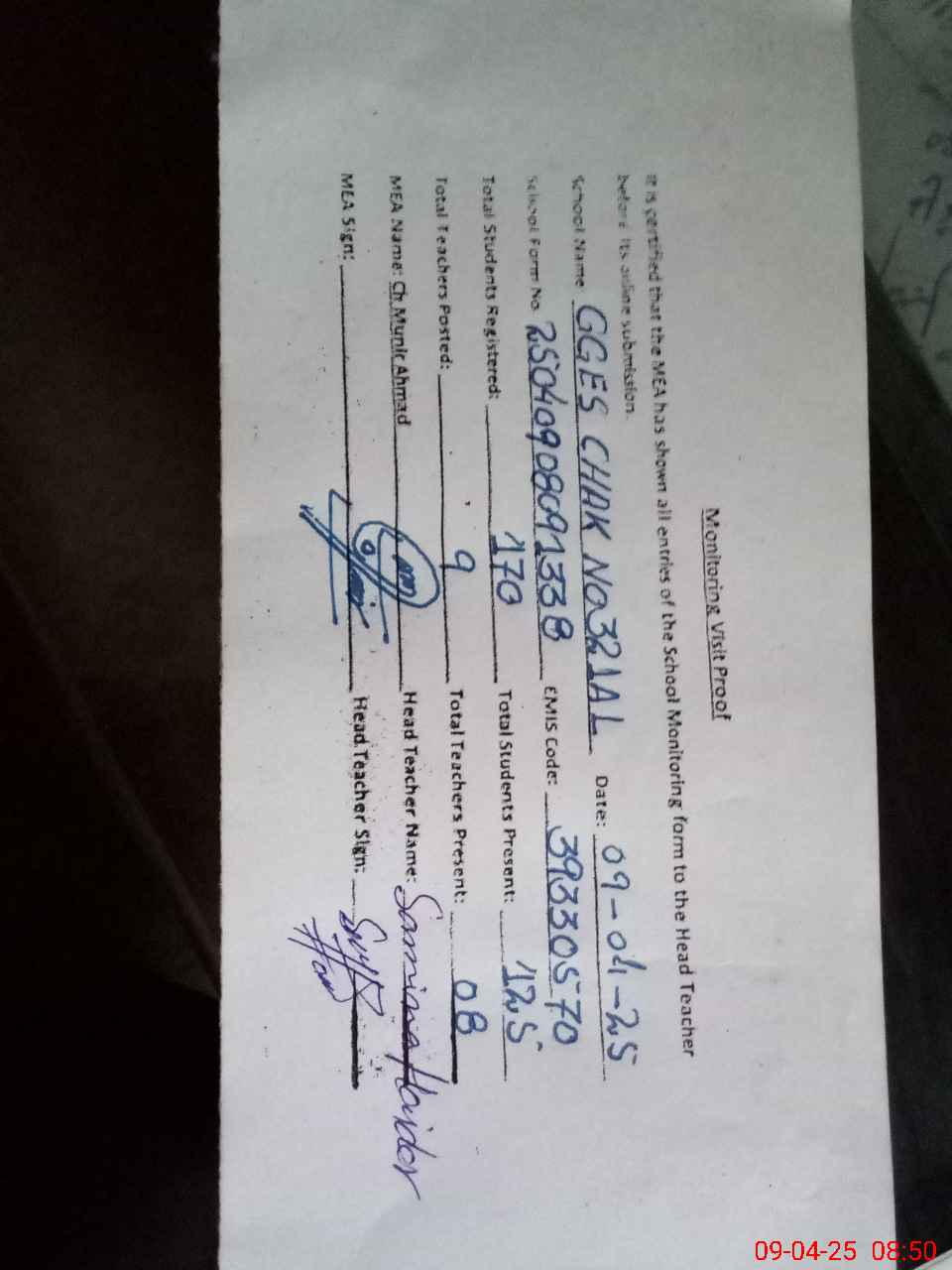 | Attendance Register | Head Teacher | MEA with School | Visit Proof |