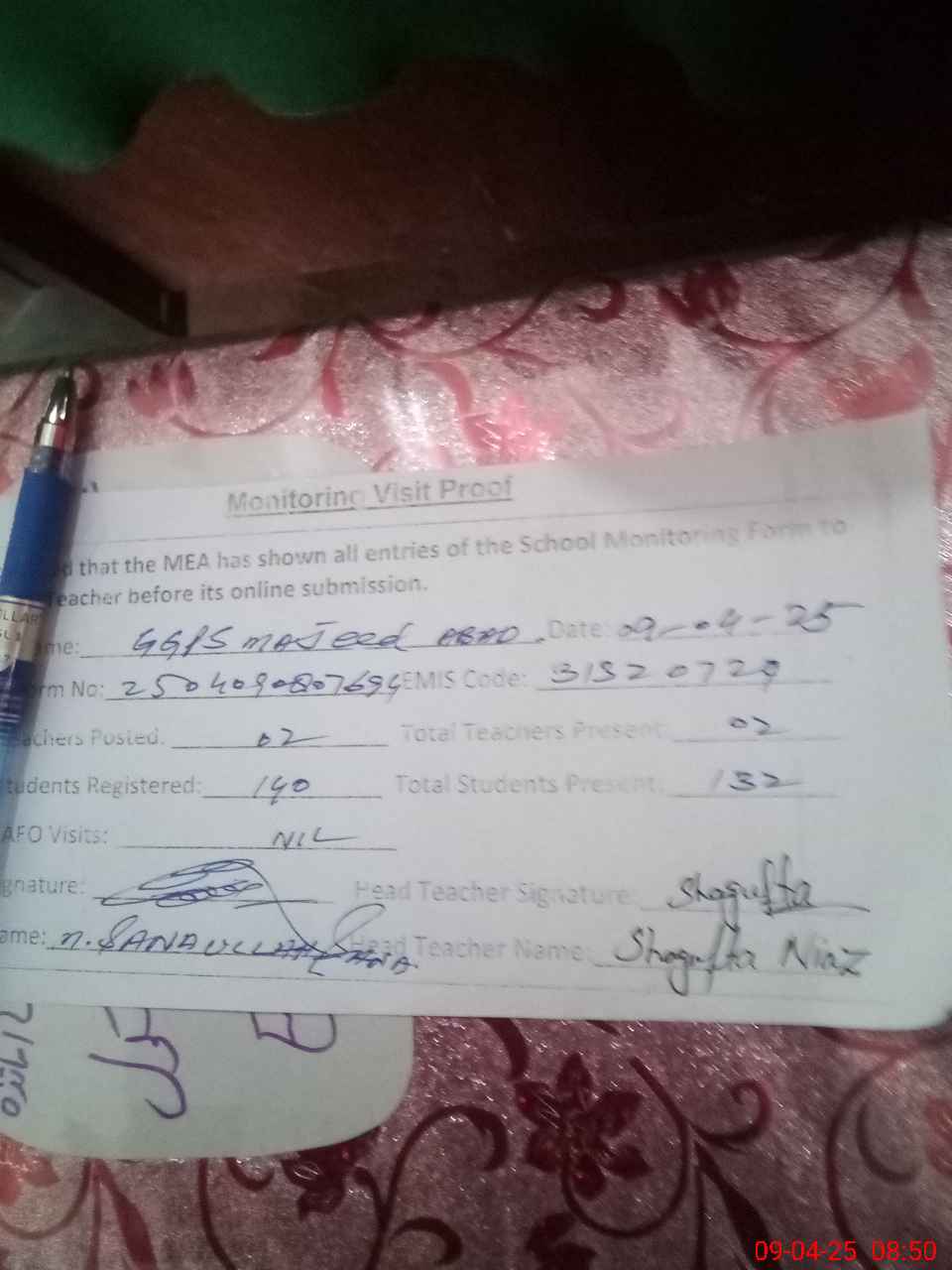 | Attendance Register | Head Teacher | MEA with School | Visit Proof |